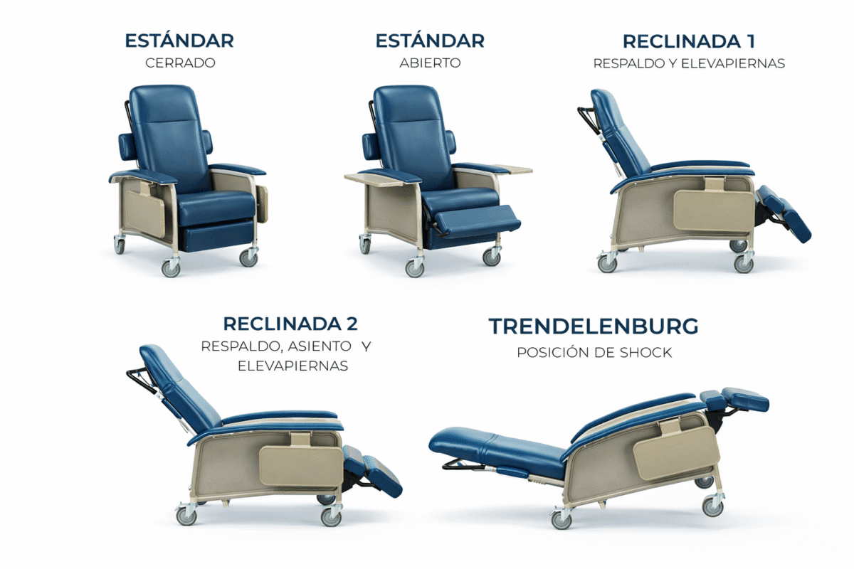 - La silla se puede colocar en 4 posiciones: vertical, TV, reclinación total y de Trendelenburg.